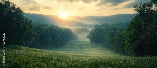 Obraz premium Serene countryside landscape at dawn with misty hills and lush greenery under...