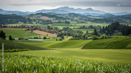 © AlexPhototest, Fototapeta premium serene countryside landscape just before storm, showcasing lush green fields, rolling hills, and distant mountains under moody sky. scene evokes sense of calm and anticipation