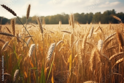 Fototapeta premium serene countryside landscape with a golden wheat field and tall trees....