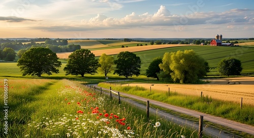 © Goni, Obraz premium Serene Countryside Landscape with Rolling Hills and Farmland.