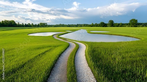 © Phichaphat, Fototapeta premium Serene Countryside Path with Ponds - Aerial Views
