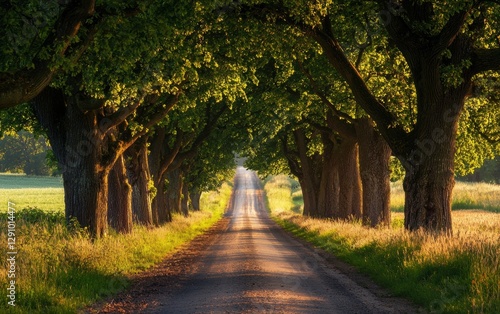 Fototapeta premium Serene countryside road lined with ancient oak trees