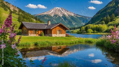 Naklejka premium Serene Countryside with Lake, Flowers, and Cottage in Vibrant Spring Setting