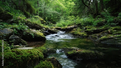 © darshika, Fototapeta premium Serene creek flowing through a lush forest.