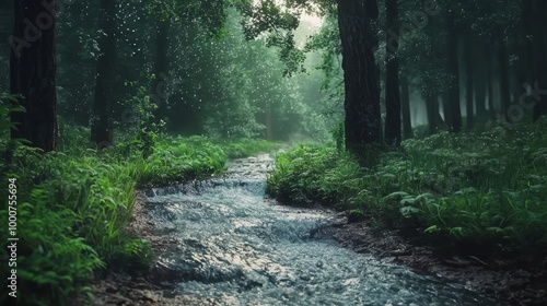 © Jakkarin, Obraz premium Serene Creek in Lush Forest Overflows After Heavy Rainfall - Natural Disaster Concept in Nature