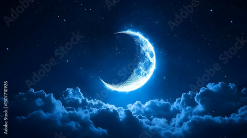 © Dibani, Fototapeta premium Serene crescent moon glowing above a sea of clouds at night, perfect for dreamlike, peaceful, or mystical themes