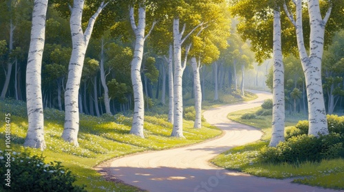 © 69, Fototapeta premium Serene Curved Pathway in Lush Forest Environment