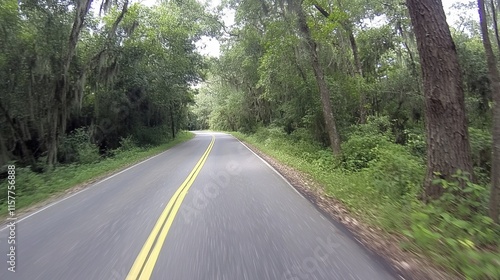 Fototapeta premium Serene Curved Road Through Lush Green Forest in Bright Natural Light