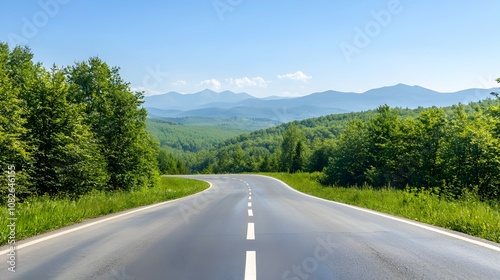 Naklejka premium Serene Curving Road Through Forested Hills - Peaceful Holiday Trip with...