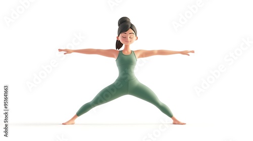 © Keattipoom, Obraz premium Serene 3D Cartoon Woman in Green Yoga Attire Performing Reverse Warrior Pose with Extended Arms on White Background
