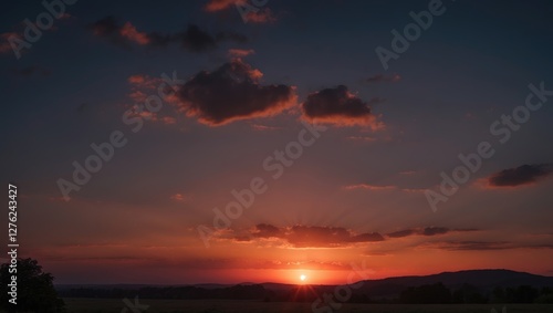© The 2R Artificiality, Obraz premium Serene Dark Sunset Over Rolling Hills with Colorful Clouds and Silhouetted Landscape