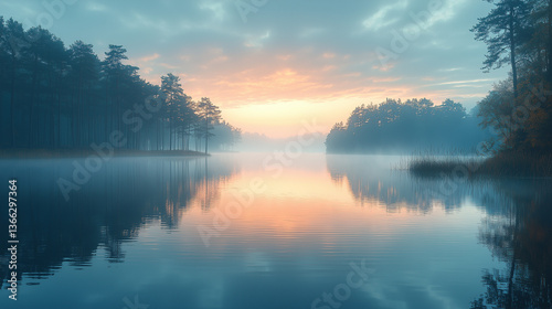 © Nei Mar, Fototapeta premium Serene Dawn at Lake with Misty Reflections and Pine Trees