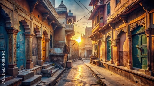 © Adisorn, Obraz premium Serene Dawn: Old Indian Street, Golden Hour, Tranquil Atmosphere