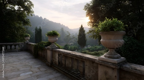 Obraz premium Serene dawn over a formal garden viewed from an ancient stone terrace with ornamental urns