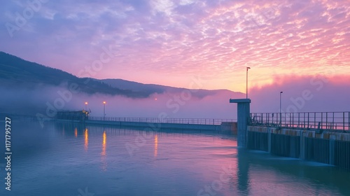 Obraz premium Serene Dawn Over Calm Waters at Pier