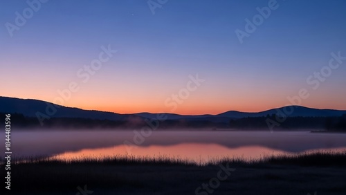 © Imam, Fototapeta premium Serene Dawn Over Misty Lake - A Tranquil Landscape Reflection.