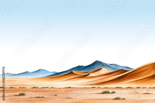 © LittleDuck, Fototapeta premium Serene Desert Dunescape - Vast, undulating sand dunes meet a hazy mountain range under a pale blue sky. Symbolizing freedom, serenity, adventure, mystery, and the passage of time