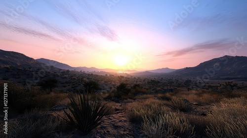 © artzone, Obraz premium Serene Desert Sunset Landscape with Warm Colors and Majestic Mountains
