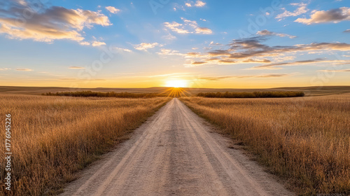 Fototapeta premium Serene dirt road stretches toward glowing horizon, surrounded by golden fields under vibrant sky