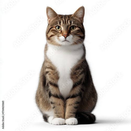 © KAZI DESIGN, Obraz premium Serene domestic tabby cat with beautiful brown stripes and a prominent white chest, sitting composedly on a bright white studio background, gazing directly forward, a captivating feline portrait