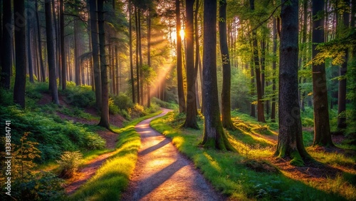 © prapatsorn, Fototapeta premium Serene Dusk Forest Path: Winding Trail Through Tranquil Woods