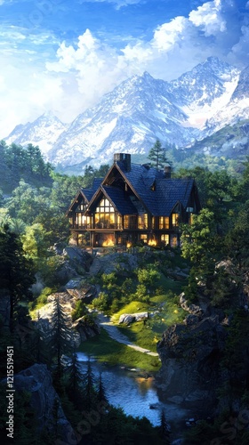 © Nakorn, Fototapeta premium Serene dusk lighting illuminates an enchanting mountain lodge nature paradise gigapixel artwork dreamlike environment
