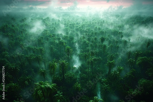 © LAB.Photo, Obraz premium Serene Dusk: Lush Green Forest Canopy and Pink Sky with Waves on Shore