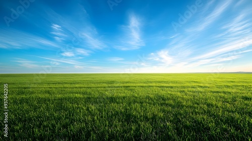 Fototapeta premium Serene Early Morning Landscape with Vast Green Meadow Under Bright Blue Sky with Wispy Clouds