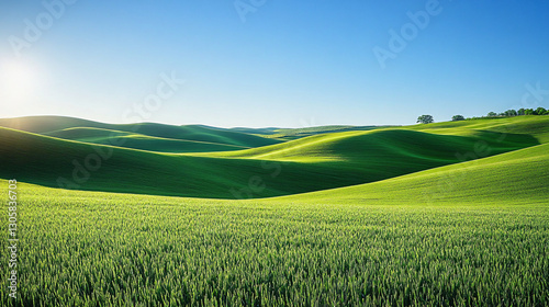 Fototapeta premium Serene early morning scene of rolling green hills under a clear blue sky,...
