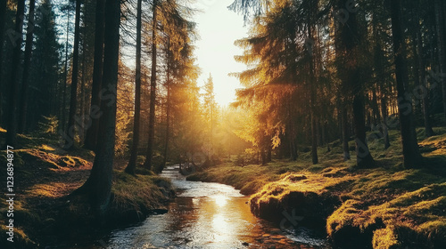 © Taras Vykhopen, Obraz premium Serene early spring forest with winding river and golden sunlight filtering through branches