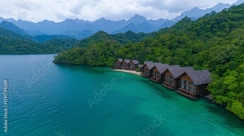 Naklejka premium Serene Eco Resort Surrounded by Lush Mountains and Tranquil Waters in Nature