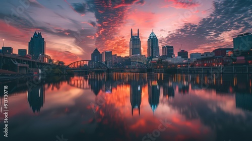 Naklejka premium serene elegance of a city skyline reflected in a calm river.
