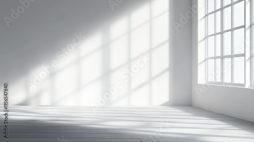 Fototapeta premium Serene Empty Room with Large Window, White Walls, Abstract studio background