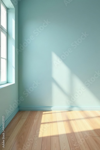 © yut, Fototapeta premium Serene Empty Room with Sunlight Streaming Through Window, Light Wood Floor, and Pale Green Walls, Ready for Interior Design Concepts
