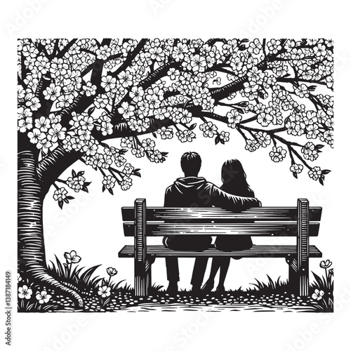 Fototapeta premium Serene encounter couple on bench embraced by cherry blossoms illustration