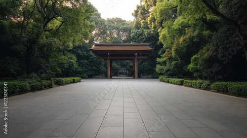 Obraz premium Serene entrance path to Japanese shrine surrounded by lush greenery and...