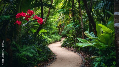 Fototapeta premium Serene Escape: Discovering a Secret Jungle Trail Amidst Towering Trees and Exotic Blooms
