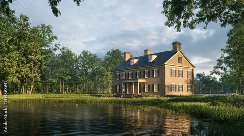 Fototapeta premium Serene Estate by the Lake: A Tranquil Lakeside Mansion