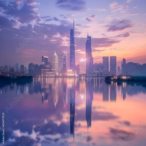 Fototapeta premium Serene Evening Cityscape with Twilight Sky and Illuminated Skyline Reflecting...