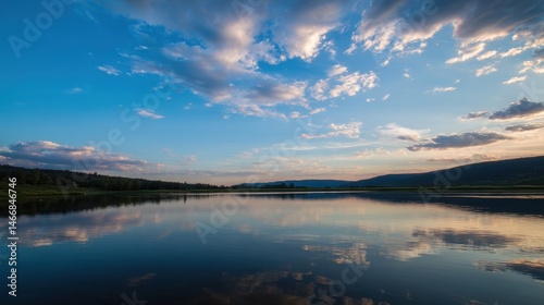 Fototapeta premium Serene Evening Reflection Over Tranquil Lake Under a Vast Sky with Soft...