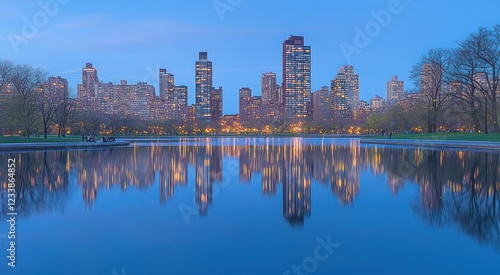 Obraz premium Serene Evening Reflection Skyline over Calm Water