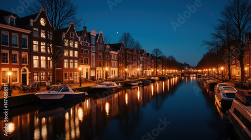 Fototapeta premium serene evening scene of canal in Amsterdam, featuring charming buildings, boats, and soft streetlights reflecting on water
