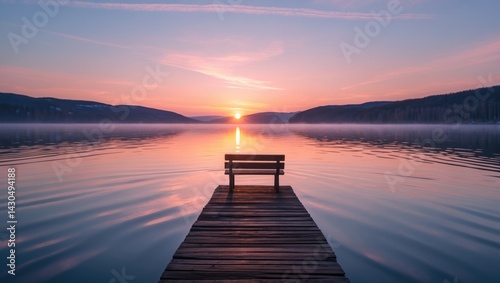 © Seyyar, Naklejka premium Serene evening scene with sunset reflection on a frozen lake in Burgenland during winter