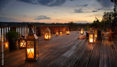 Naklejka premium Serene Evening Setting With Lanterns And Candles On A Wooden Deck