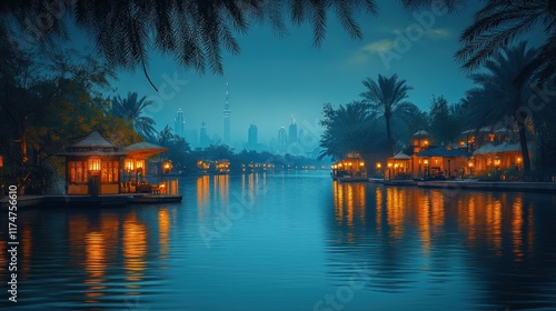 © AnggunArtworks, Fototapeta premium Serene evening view of a waterway with illuminated structures and a city skyline backdrop.
