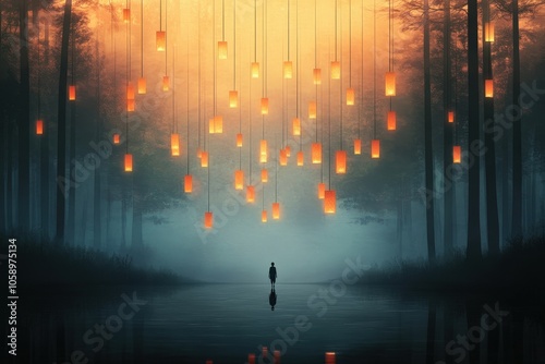 Obraz premium Serene Evening with Lanterns in Misty Forest