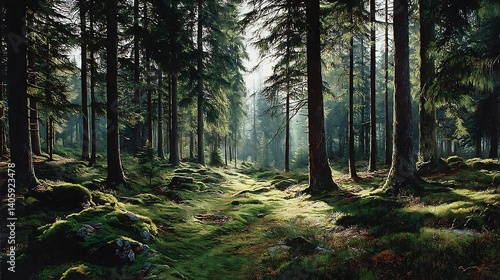 © EpochXstudio, Obraz premium Serene evergreen forest tall stately conifers bathed in soft morning light their shadows playing gently over a carpet of moss and pine needles