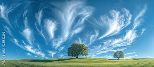 Fototapeta premium Serene field, two trees, swirling cloudscape, nature scene