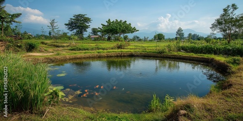 © Gular, Fototapeta premium Serene fish pond nestled amidst rice fields during the dry season, showcasing the harmonious blend of nature. This enchanting fish pond complements the rustic beauty of agricultural landscapes.