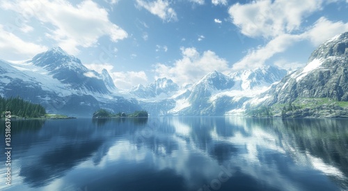 Naklejka premium Serene fjord, snow-capped mountains, calm waters, sunny sky, travel brochure